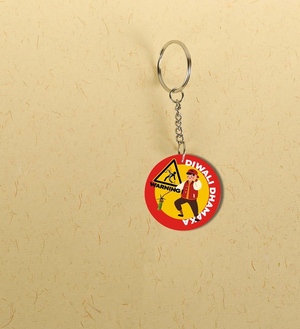 "Bring Diwali Cheer to Your Family with the Big Red Cracker Pataka Keychain - Printed Round Keychain Pack of 2"