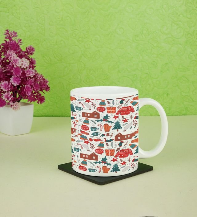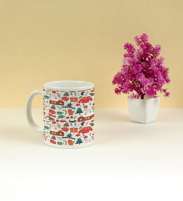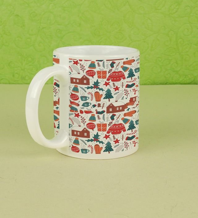 A Festive Pattern of Christmas Trees and Cozy Houses for a Cozy Sip Printed Coffee Mug