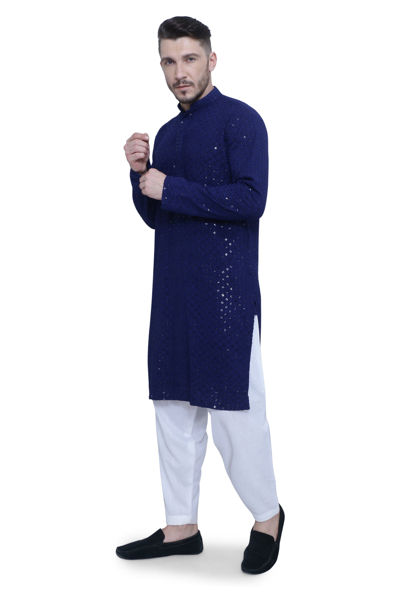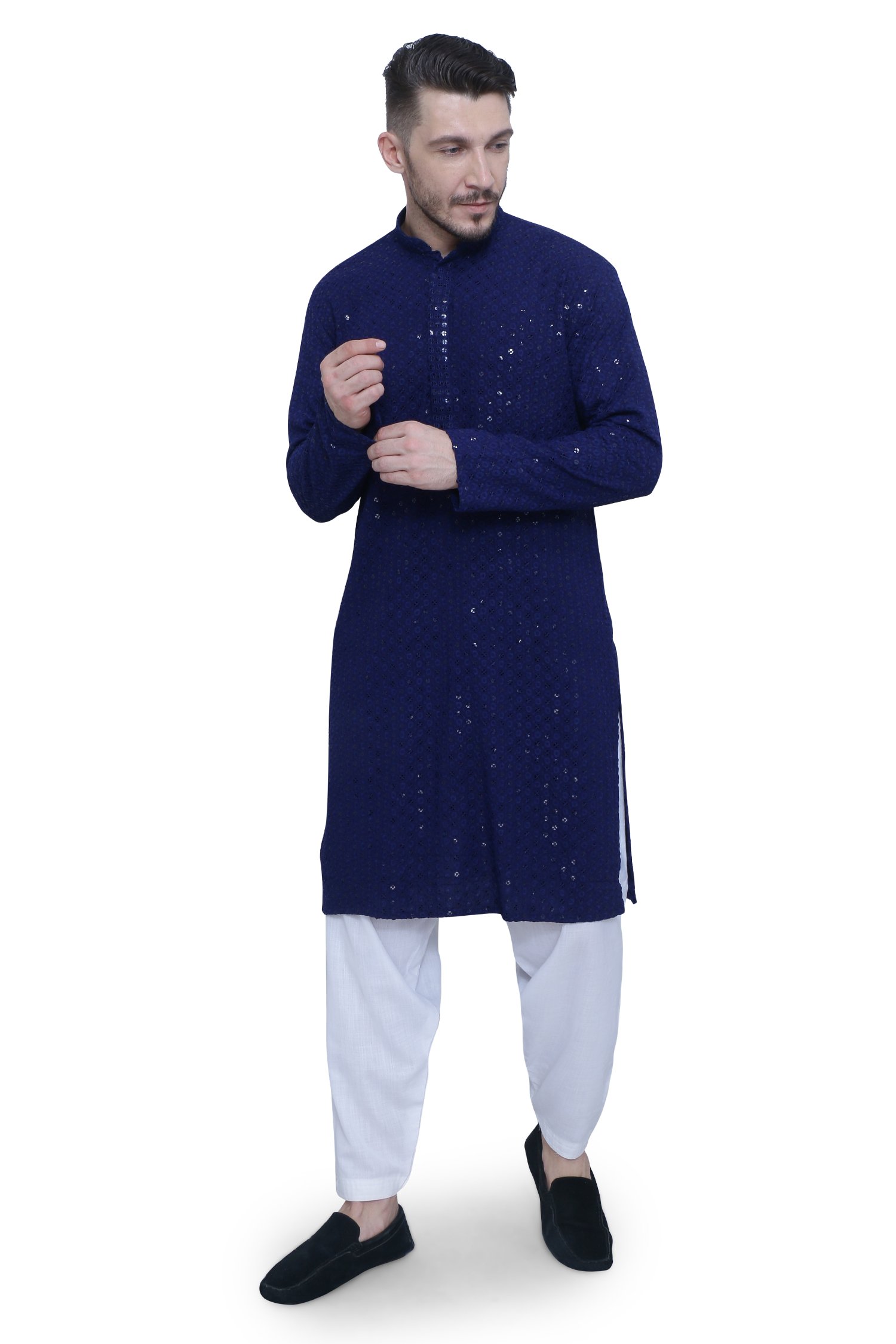 Indulge in regal elegance with our Royal Blue Chikankari Men's Kurta Set. Crafted from the finest Chikankari fabric, this ensemble offers a perfect blend of comfort and style. The rich Royal Blue color exudes sophistication, while the intricate chikankari embroidery adds a touch of timeless craftsmanship