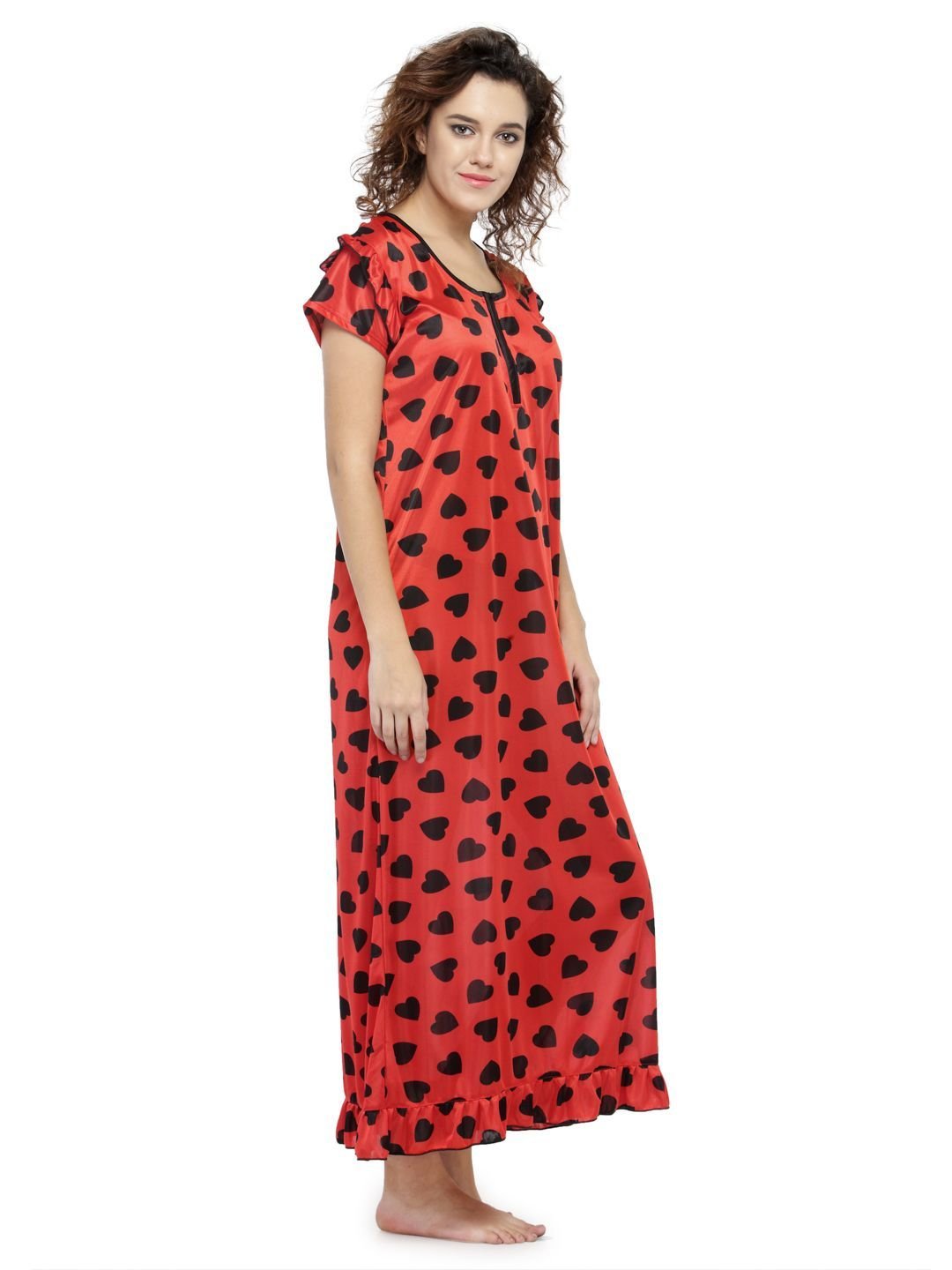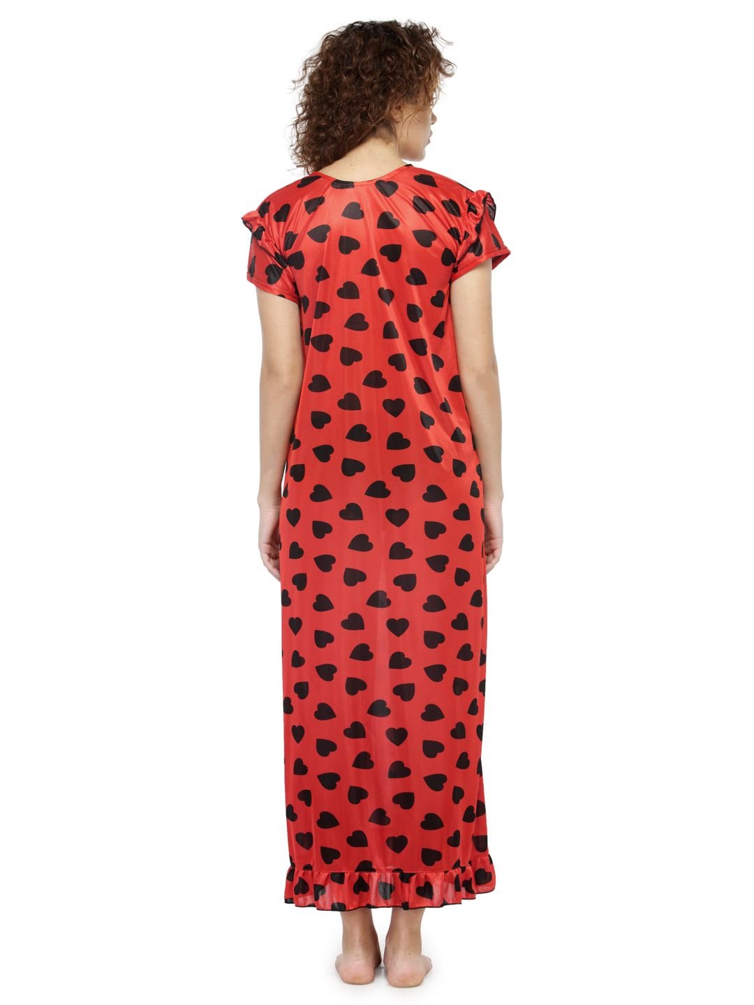 N-Gal Women's Satin Short Sleeves Hearts Print Maxi Nightwear Nightdress_Red