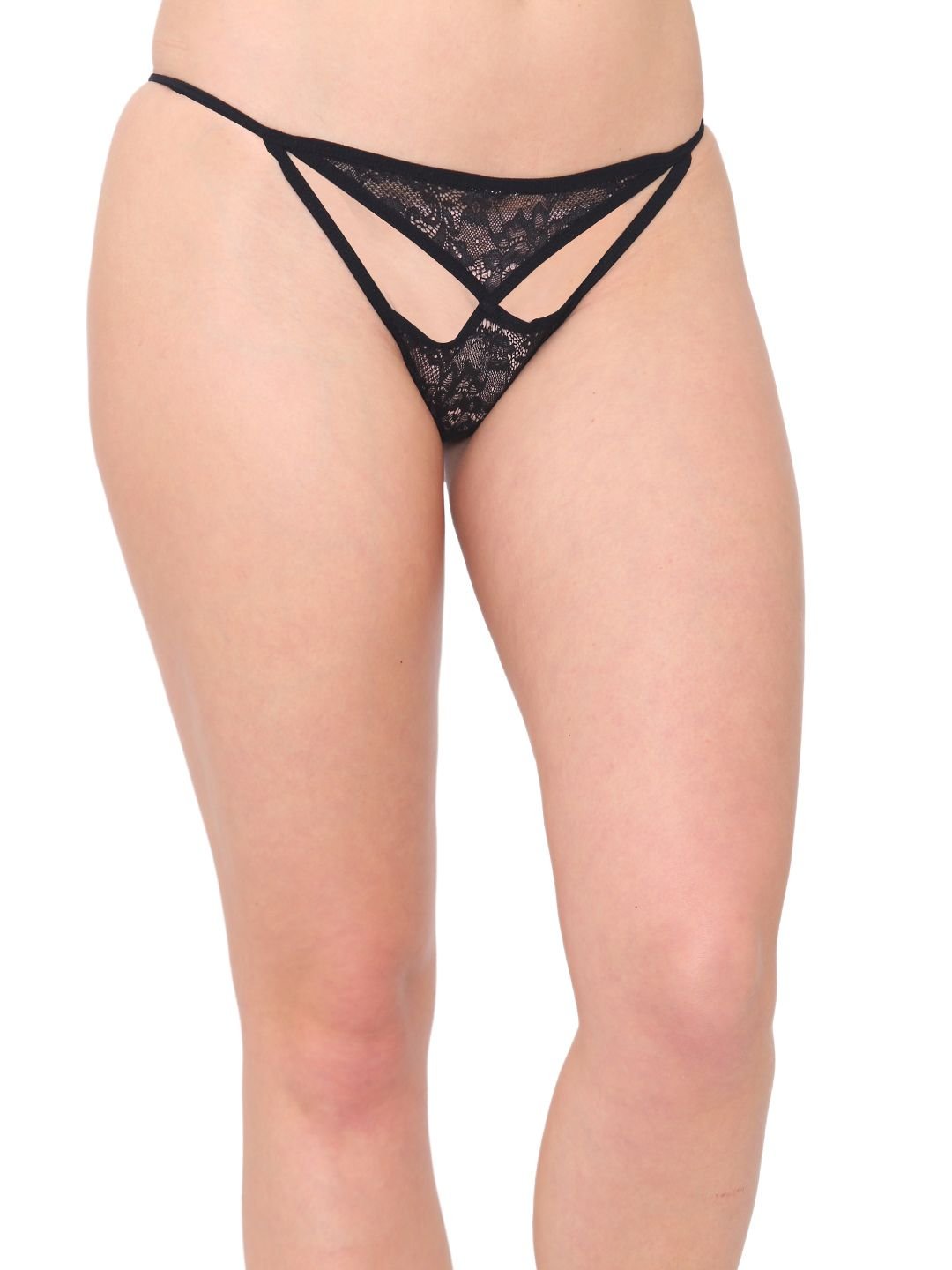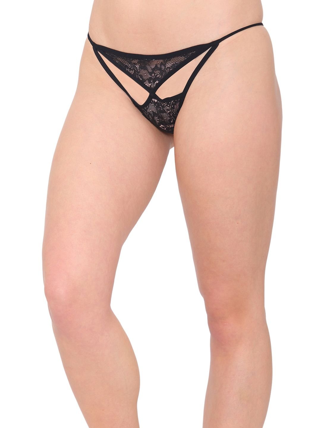 N-Gal Women's Sheer Lace Cut Out Adjustable Waist Band G-String Thong Panty_Black