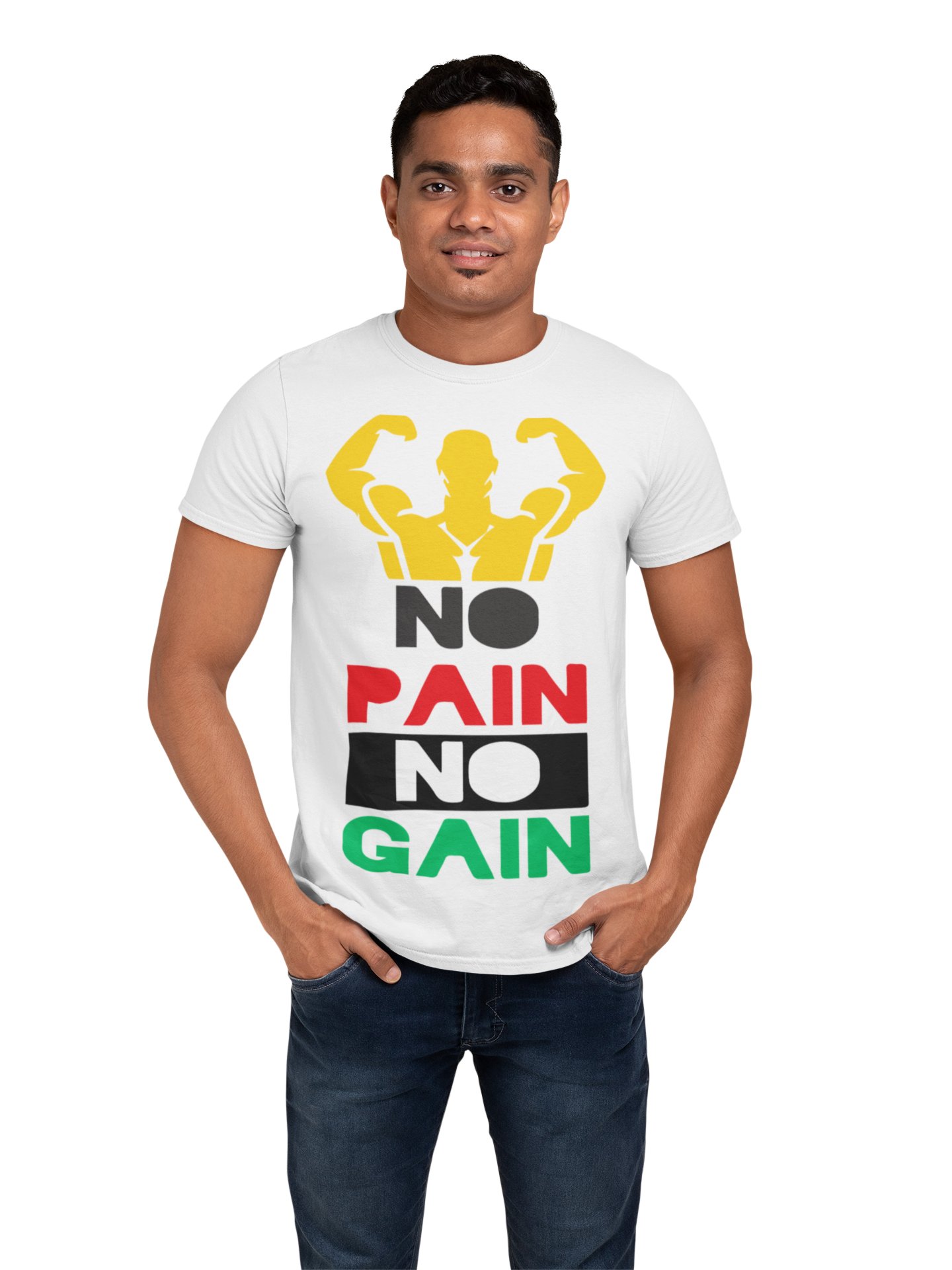 No Pain, No Gain, (BG Yellow, Red, White, Black and Green), Round Neck Gym Tshirt (White Tshirt) - Clothes for Gym Lovers - Suitable for Gym Going Person - Foremost Gifting Material for Your Friends and Close Ones