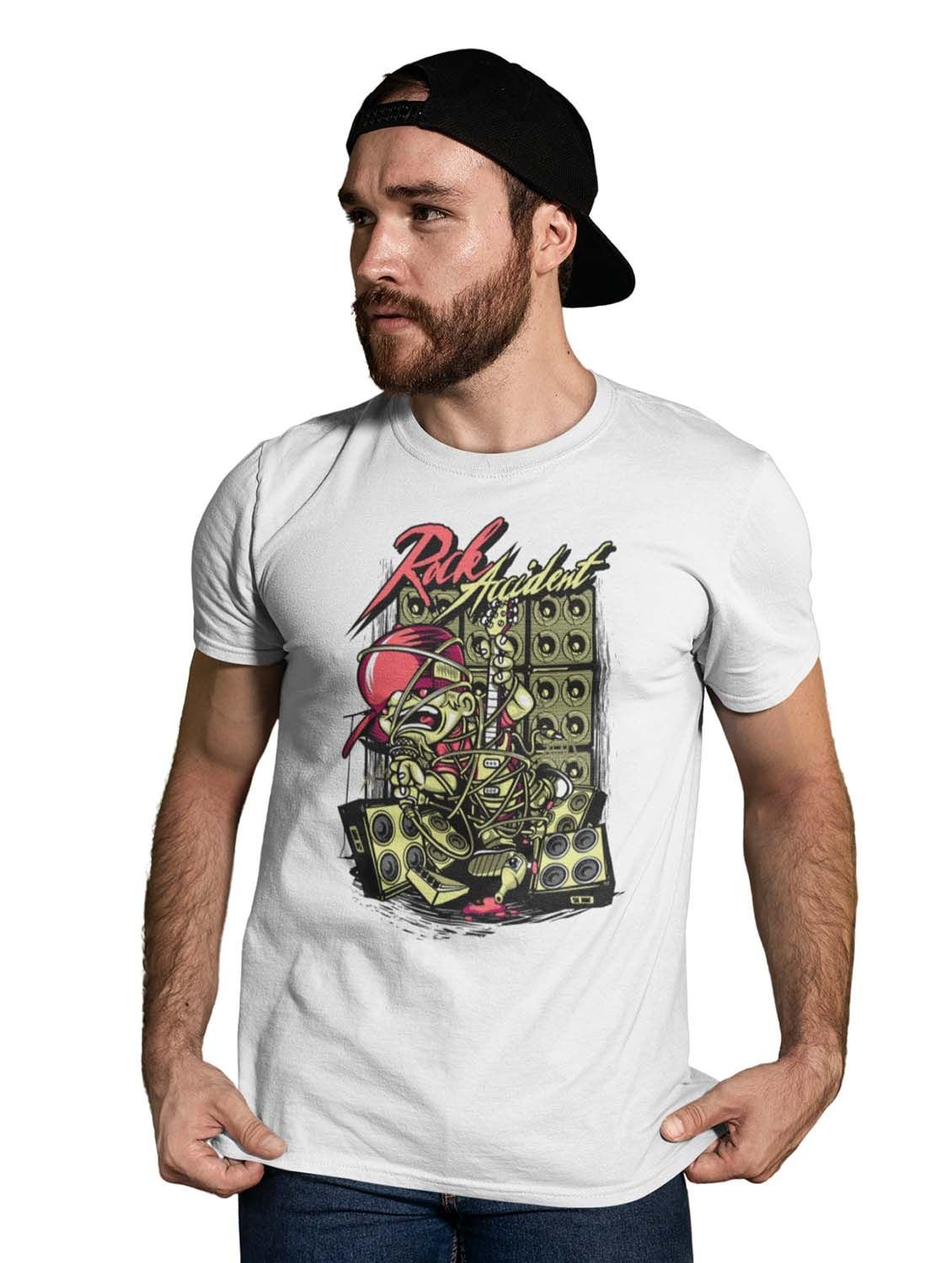 Rock Accident White Round Neck Cotton Half Sleeved T-Shirt with Printed Graphics